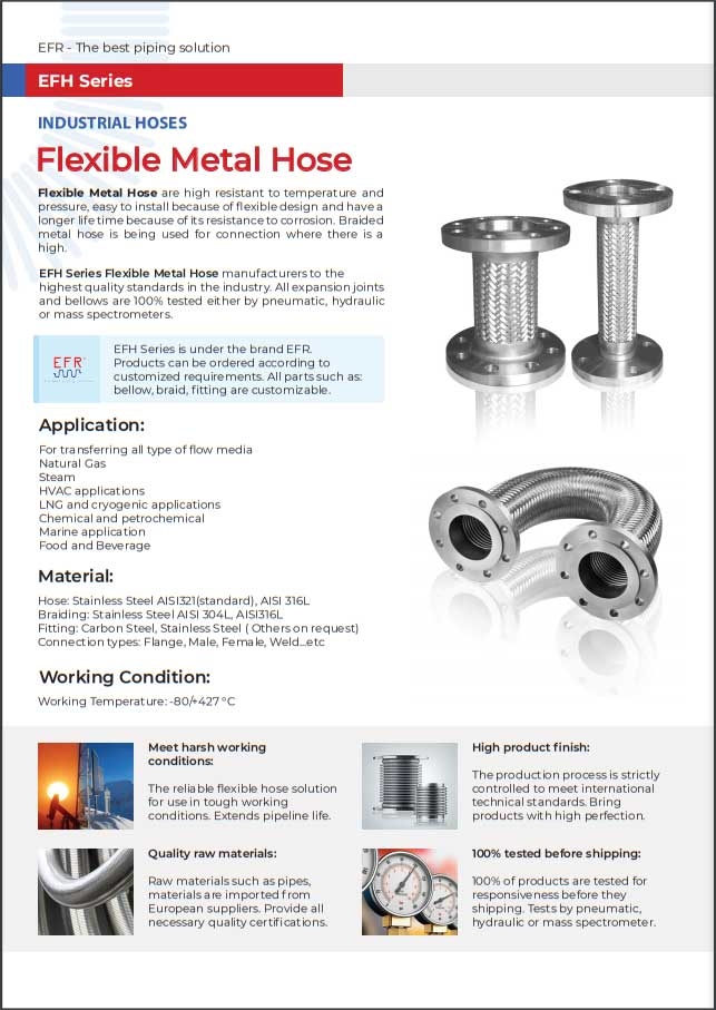 Dòng khớp nối mềm inox hay còn gọi là Flexible Metal Hose trong tiếng Anh được sản xuất trực tiếp tại nhà máy của E-Flex Việt Nam với nguồn nguyên liệu ống mềm nhập khẩu từ Mỹ/Thổ Nhỹ Kỳ. Thành phẩm có độ hoàn thiện cao phù hợp với đa dạng nhu cầu kỹ thuật trên thị trường.