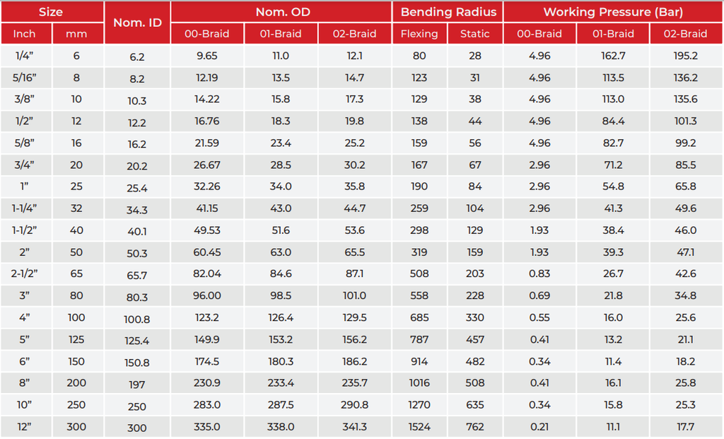 Chú ý: Tất cả các kích thước trong bảng được tính bằng "mm". Ống mềm cho áp suất cao và cực cao có thể được thiết kế đặc biệt.