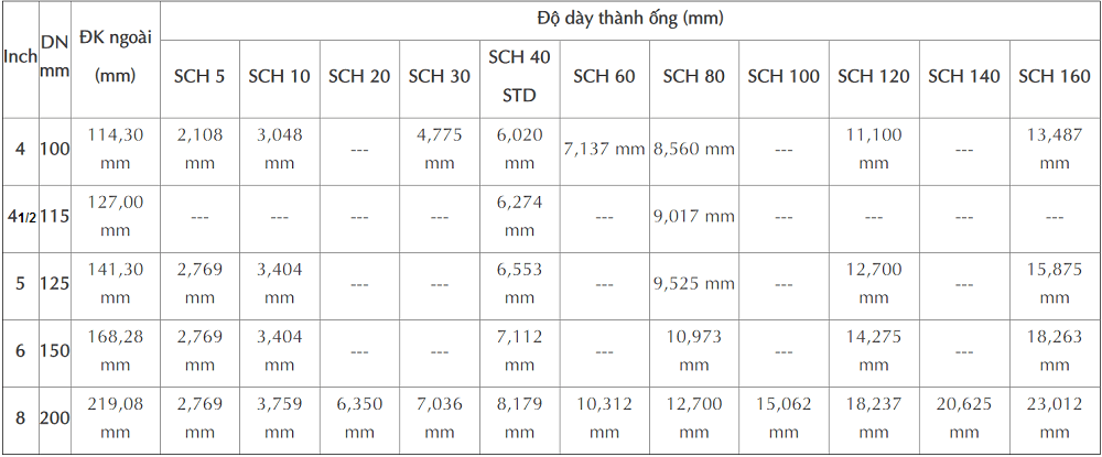 Bảng quy đổi 4" tới 8" (DN100 tới DN200)