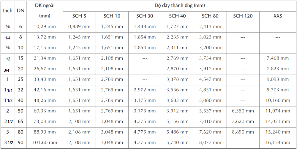 Bảng quy đổi 1/8" tới 3.1/2" (DN6 tới DN90)